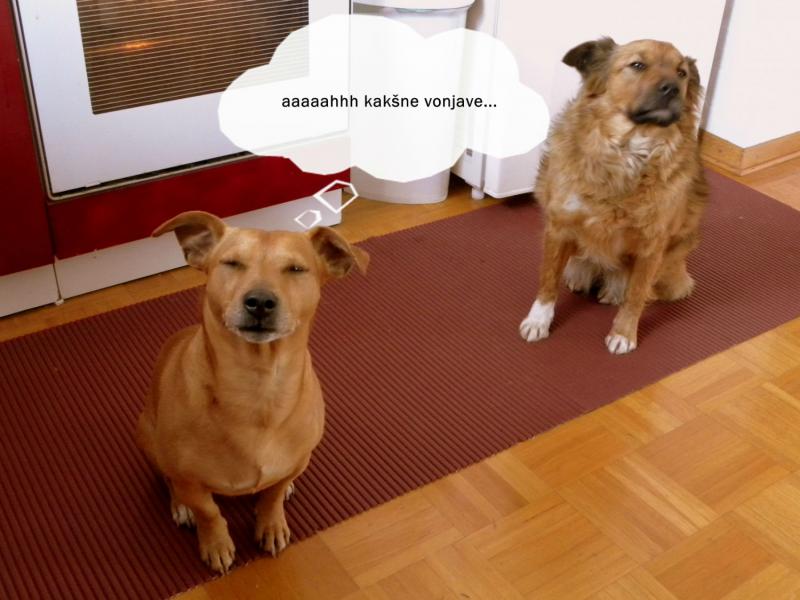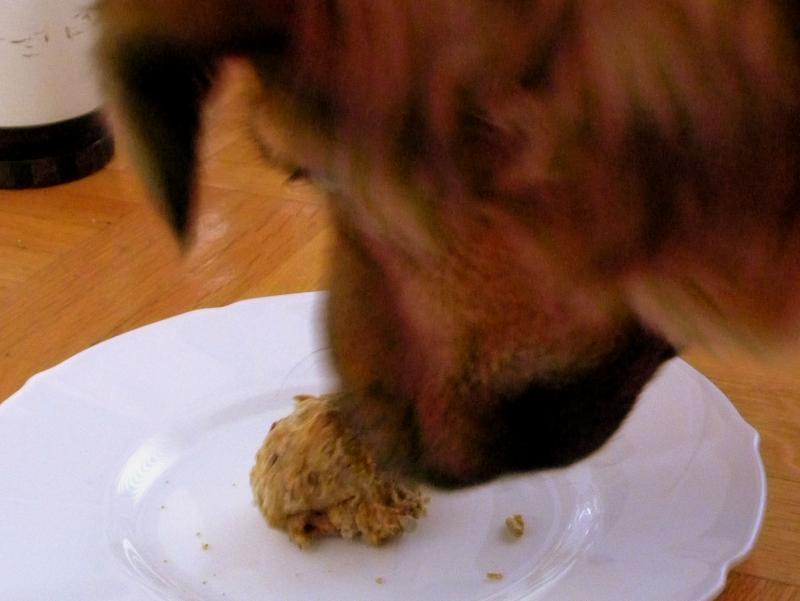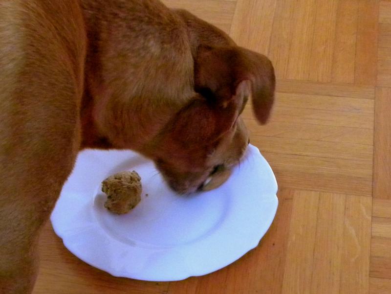 Naš Max je bil čisto prehiter za fotoaparat, Rina pa je prava mala dama in si je vzela čas, za vizuelen vtis piškotkov. Zaradi tune jih je priporočljivo hraniti v hladilniku, vendar le nekaj dni. Ne pozabite... preden jih ponudite štirinožcu, naj bodo nekaj časa na sobni temperaturi.
