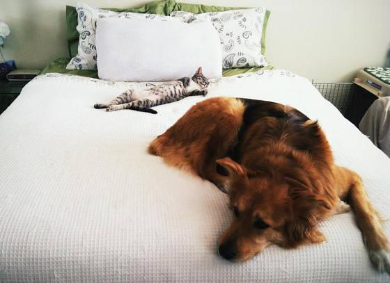 Čeprav je muc psičku večkrat vsiljivo nagajal, ta ni nikoli agresivno reagiral. Skupaj se cel dan igrata in celo večerjata ob istih urah.
