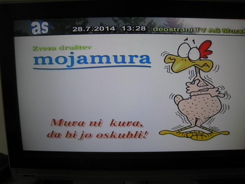 Na pomurskih lokalnih televizijah se oglašuje tudi Zveza društev Moja Mura. Gre za ekološka društva, ki želi zaščititi porečje Mure, kar je hvalevredno delo, vendar ni jasno, zakaj morajo uporabljati tako nespameten slogan. "Mura ni kura, da bi jo oskubli." Vem, da so imeli v mislih le rimo, a ne vem, kakšno zvezo ima skubljenje kure z uničevanjem Mure. Ker je predsednik te zveze mož predsednice DZZŽ Pomurja, je tak slogan še toliko bolj neokusen.