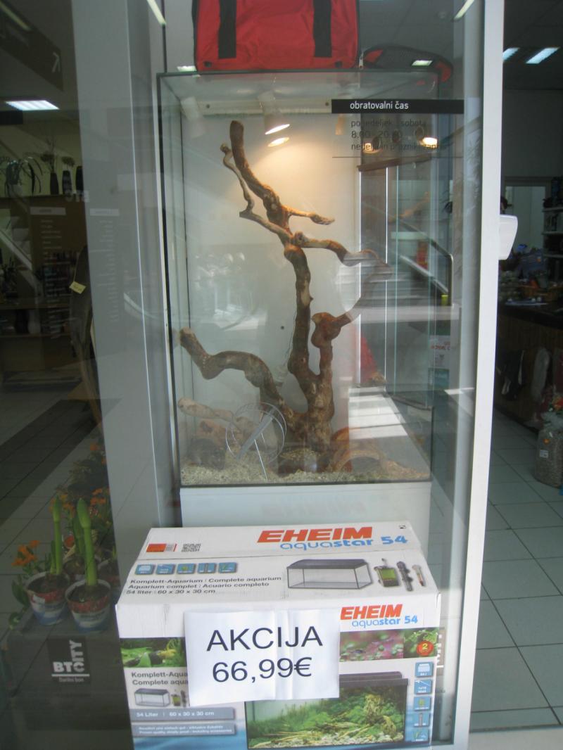 Druga trgovina je v BTC - Zoo Market, "trgovina za živali", ki bi morala biti imenovana "trgovina z živalmi". Majhna trgovina, v katero je natlačenih kup akvarijev in kletk, izbire glede opreme za živali pa skoraj ni. Nekaj časa so imeli na blagajniškem pultu majhen načičkan akvarij, primeren morda le za namizni dekor s kamenčki, v katerem je lebdela zlata riba. Povedala sem prodajalki, da je akvarij povsem neprimeren in premajhen zanjo, da zlata riba ne bi smela biti sama, saj gre za jatno žival. Vzvišeno me je zavrnila, da je vse dobro, ker "v vseh knjigah piše, da mora biti na 1 cm ribe 1 liter vode". Po tej logiki bi zlato ribo, ki doseže 40 cm, lahko imeli v 40 litrov vode? Zdrava pamet, izgubljeni zaklad ... Nato me je hotela kot majhnega otroka zamotiti s tem, da bo akvarijček tam le še en teden, nato ga bodo umaknili. Po nekaj tednih so ga res.