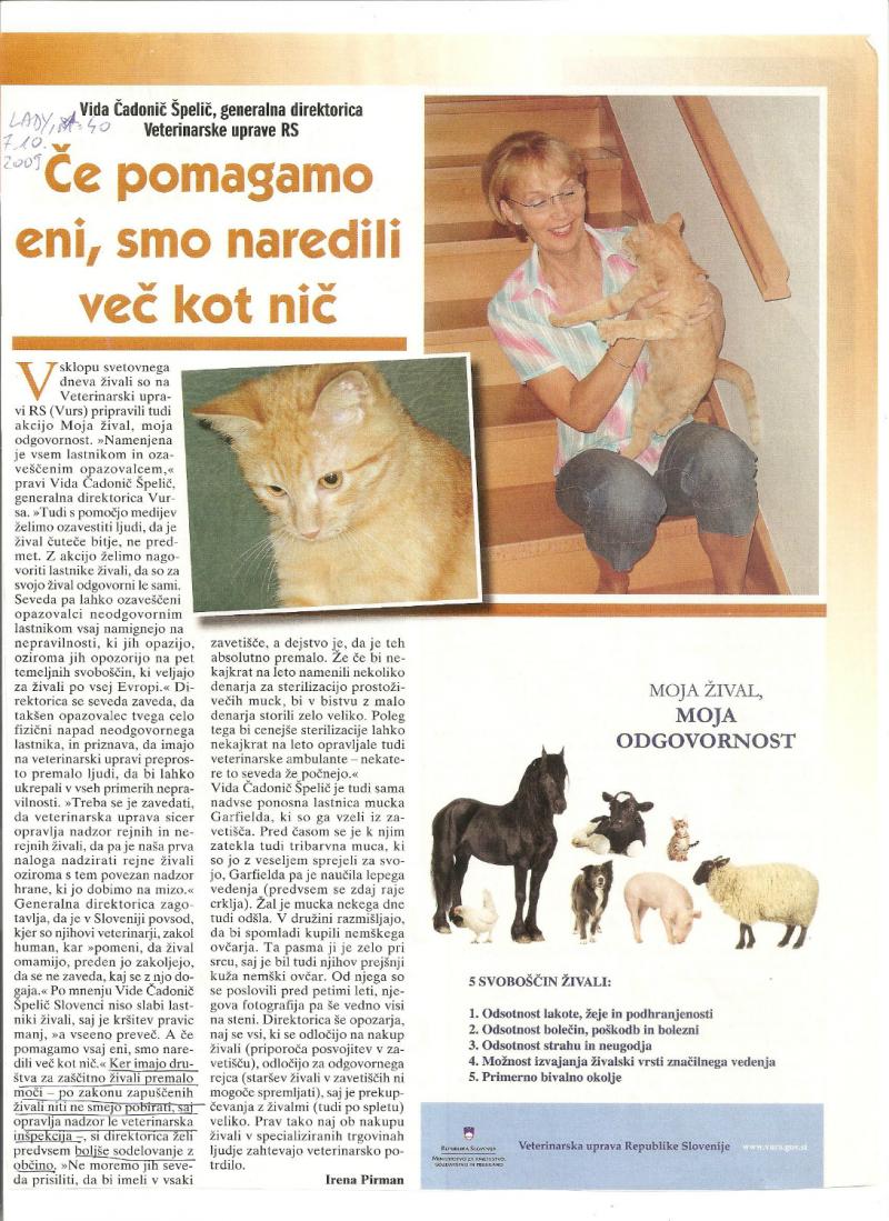 8. Za 110 jumbo plakatov Moja žival, moja odgovornost je VURS zapravil 23.000 € (koliko so stali letaki in knjižice, ni znano). Poučenim zadeva ni povedala nič, nepoučenim prav tako ne, ker so bili neživljenjski. Preveč strokovni, nejasni, edino jasno sporočilo pa je bilo to, da zvračajo vso skrb za živali na njihove lastnike. Mrtva črka na papirju. Vsak lastnik živali oziroma vsaka oseba, ki se z živalmi kakorkoli ukvarja, bi moral zakonodajo vsaj v grobem poznati, opravičil za nepoznavanje več ni, znanje je dostopno. Veliko ljudi noče upoštevati tega, kar je dobro za žival, zato si sankcije zaslužijo, saj so njihova ravnanja namerna. Tisk takšnega kupa papirja je le metanje denarja stran in onesnaževanje okolja.