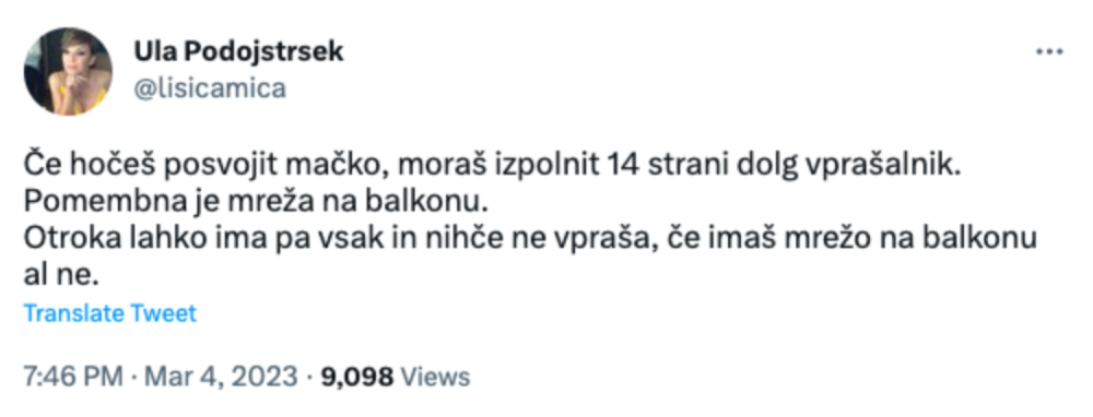 Najprej - izjemno sem vesela, da se pod tvitom niso zvrstile samo histerične reakcije v stilu “KAJ SE PA GREJO, NAMESTO DA BI BILI VESELI, DA SPLOH KDO HOČE POSVOJIT MAČKO!”. Da se razumemo - bile so tudi take, ampak nekaj tviterašev pa je zahtevnim vprašalnikom in njihovim avtorjem stopilo v bran. Stvari se torej vendarle premikajo.