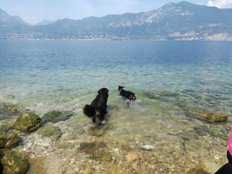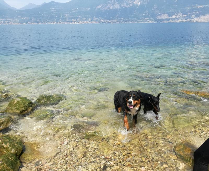 Pot nas je zanesla do Gardskega jezera, kjer pa sem bila enostavno navdušena. Čudovit ambient, kužkom dovoljen dostop v vodo (sicer na označenih mestih), vstop v lokale, kampe, hotele. Ustavili smo se na čistem severu Gardskega jezera (Riva del Garda) ter na jugu (Lazise). Brez problema so se v obeh krajih skopali, ohladili. Je pa res, da je bolj malo sence sploh v Lazisah, v Rivi se še nekako najde.