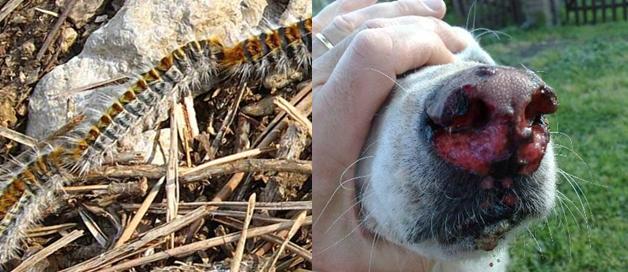 Gosenice se sicer v sprevodih, po tleh selijo iz drevesa na drevo ali do listja, s katerim se hranijo. V tem času lahko pride do tega, da jih v svojem gobčku iz radovednosti, ali povsem nehote med brskanjem po travnati površini "okusi" tudi naš pes. Gosenice imajo drobne ožigalne in strupene dlačice, ki ob dotiku s človeško kožo povzročajo vnetje s srbečico, pri psih pa ima lahko stik še veliko bolj neprijetne posledice.